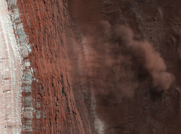 Material, likely including fine-grained ice and dust and possibly including large blocks, has detached from a towering cliff and cascaded to the gentler slopes below. The occurrence of the avalanches is spectacularly revealed by the accompanying clouds of fine material that continue to settle out of the air. The … cloud traces the path of the debris as it fell down the slope, hit the lower slope, and continues downhill, forming a billowing cloud front. This cloud is about 180 meters (590 feet) across and extends about 190 meters (625 feet) from the base of the steep cliff. Shadows to the lower left of each cloud illustrate further that these are three dimensional features hanging in the air in front of the cliff face, and not markings on the ground. Sunlight is from the upper right.